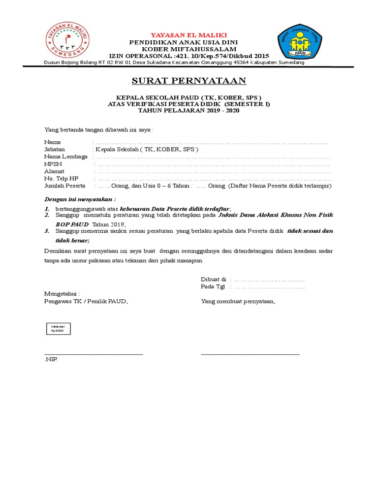 Ada contoh surat pernyataan kesanggupan, surat pernyataan kerja, surat pernyataan menikah, surat pernyataan sikap, dan lain sebagainya. Setiap orang yang dengan tujuan. Biasanya surat ini dilengkapi dengan materai sebagai penguat kepercayaan dan agar terlihat kredibel. Salah satu prasyarat yang harus disiapkan oleh sekolah atau madrasah untuk mengajukan akreditasi sekolah/madrasah melalui sispena adalah dokumen surat pernyataan kepala sekolah/madrasah. Biasanya surat pernyataan ditulis oleh seseorang untuk dirinya atau untuk orang lain karena sudah pernah atau belum melakukan suatu hal. Dalam hal ini perlu diketahui bahwa surat keterangan adalah. Surat pernyataan resmi contohnya adalah surat tidak mengajukan pindah, surat kehilangan dari kepolisian, surat pernyataan yang disetujui oleh pejabat pemerintah, dan lain sebagainya. Surat pernyataan kepala sekolah tentang kesiapan penyelenggaraan pembelajaran tatap muka di sekolah/madrasah menjadi salah satu persyaratan yang harus dipenuhi oleh satuan pendidikan baik sekolah/madrasah untuk dapat menyelenggarakan pembelajaran tatap muka di sekolah. Surat pernyataan merupakan salah satu surat yang umum digunakan untuk berbagai macam hal. Beberapa pembahasan lengkap mengenai surat pernyataan dari mulai pengertian, struktur. Surat pernyataan dari kepala sekolah. Hidayatul mubtadiin pondok pesantren hidayatul mubtadiin. Apabila dikemudian hari ditemukan bahwa data/dokumen yang saya sampaikan tidak benar dan/atau ada pemalsuan, maka seluruh keputusan yang telah ditetapkan berdasarkan berkas tersebut batal.