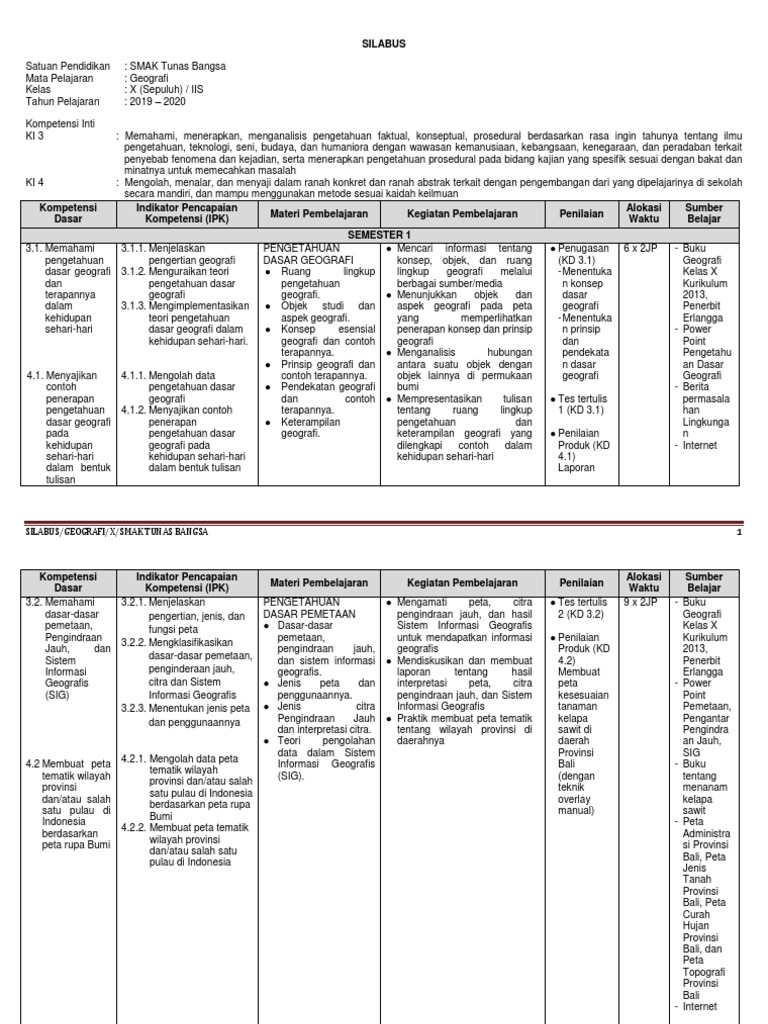 Download Silabus Geografi Kelas Xi Kurikulum 2013 from imgv2-1-f.scribdassets.com Hai sahabat ilmuguru, dalam kesempatan kali ini admin ingin share perangkat pembelajaran berupa silabus sma kelas x (10) kurikulum 2013 revisi terbaru. Download juga kumpulan silabus sd kurikulum 2013 semua mata pelajaran revisi. Peta, penginderaan jauh, dan sig 3. Bagi yang ingin melihat contoh silabus matpel geografi sma kelas x silahkan lihat dibawah. Perangkat pembelajaran rpp tahun 2020 versi 1 lembar daring dan luring. 9 juni 2020 18:06 diperbarui: Silabus merupakan salah satu bagian dari administrasi pembelajaran seorang guru. Details of silabus osn sma 2020 geografi sma kurikulum.